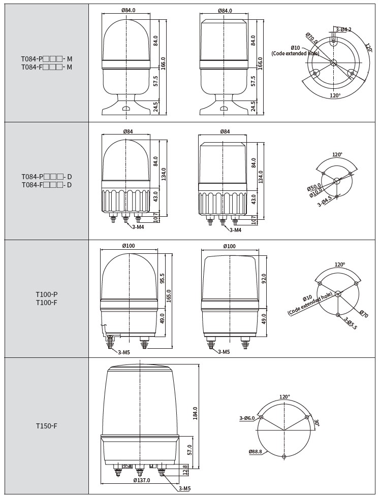 – Ø60 / Ø84 / Ø100 / Ø150 rotating continuous light, rotating continuous light and buzzer